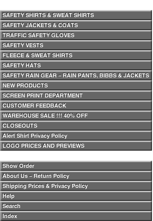 You have arrived at the Safety Clothing Store you’ve been searching for. Alert Shirt has High Visibility Clothing that ranges from Moisture Wicking Safety Shirts to various types of Safety Jackets, as well as excellent ANSI Compliant Safety Vests, Traffic Safety Gloves and Reflective Safety Hats. All of our products are produced with your Safety and Comfort in mind. You’ll be impressed with our High Quality Products and Great Service.